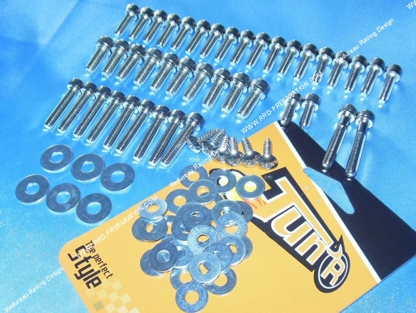 TUN 'R Decorative hardware kit steel for scooter Peugeot 50cc (see list below) that are ideal for a look tuning and racing your machine. They are of good quality, alloy and not titanium. They will therefore be ok to give a nice aesthetic touch and can even be installed on parts forces .. This comprehensive kit contains 2 screws fairing + 2 thread screw Ø5X17mm TRUSS TRUSS screw thread + 10 + 7 Ø6X21mm screw thread TRUSS Ø4X24mm + 4 screw thread TRUSS Ø4X20mm + 2 thread screw TRUSS Ø4X35mm + 6 + 31 Ø5mm Ø6mm washers washers.