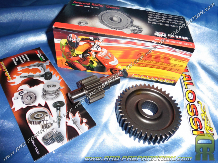 MALOSSI secondary transmission not complete without wheel shaft or primary pinion, it is therefore necessary to take the parts of the original transmission and mount them on the press. This transmission is ideal for starting fresh and gaining top speed on large configurations, in fact, we very often reach the limits of the scooter (variator and torque corrector closed and fully open, engine at full speed). ..