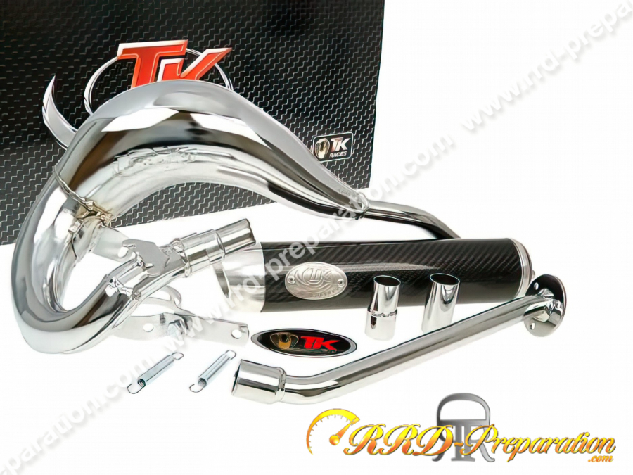 Aquí por fin está disponible el nuevo escape de paso superior derecho de la firma española TURBOKIT, versión de lujo de alta calidad para varios 50cc con caja de motor minarelli am6. Este escape hecho para el rendimiento quiere ser "ir a todas partes". Será un poco hueco en los motores originales, pero podrá explotar adecuadamente sus kits de carreras o deportivos de 50 cc con grandes diámetros (70 cc, 80 cc...). En términos de apariencia, es una carrocería soldada en jaula estampada 10/10 y luego cromada con un silenciador de aluminio mecanizado, anodizado y grabado con láser. La olla está homologada E9 y se entrega con todo el montaje necesario, el certificado de homologación...