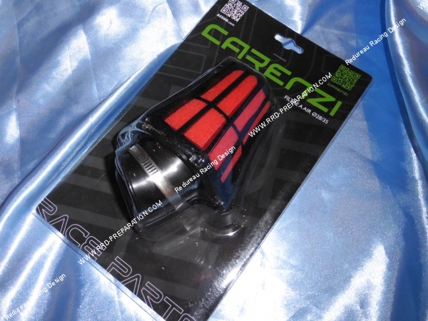 Aquí está el filtro de aire CARENZI con un diámetro de fijación de 28 a 35 mm, manguito a 30° ajustable. Con un bonito aspecto de carbono, filtrará el aire de impurezas para proteger mejor tu motor de la suciedad.