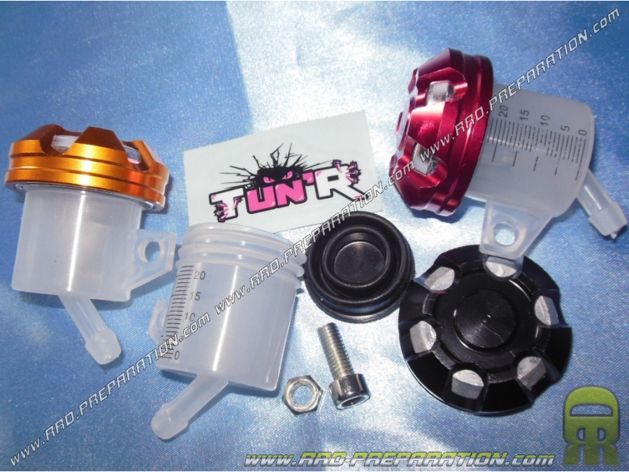 Idéal pour une remise à neuf, voici le bocal de de rechange pour maitre cylindre de frein avant TUN'R avec sortie sous le bocal incliné et bouchon aluminium anodisé Rouge, Noir ou Or.