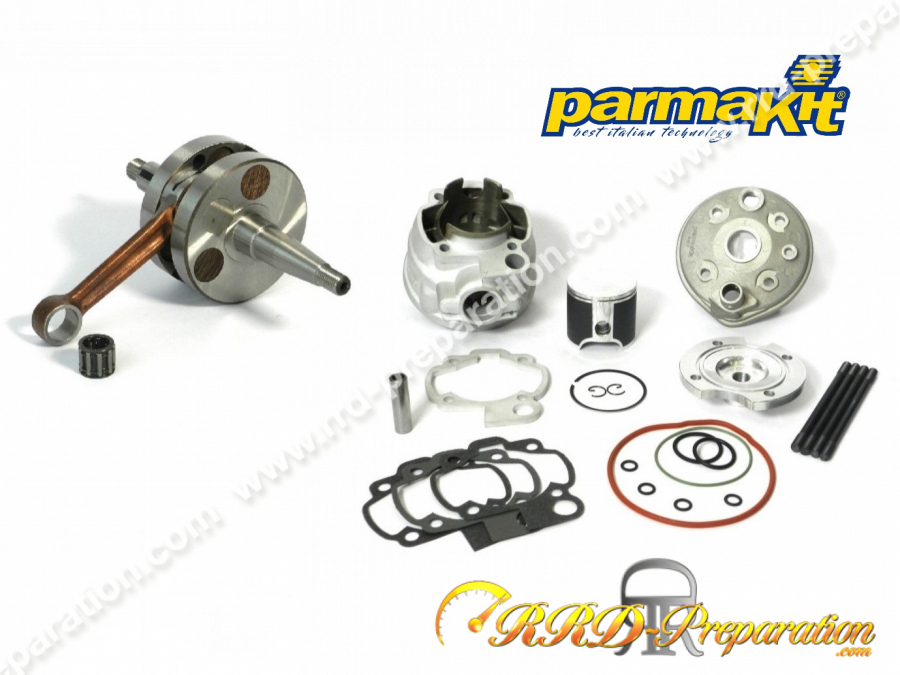Le fameux MAXIKIT PARMAKTI 110cc pour moteur MINARELLI AM6 50cc. Kit cylindre très puissant en Ø55mm, culasse a plot en bi-partie pour un meilleur refroidissement. Diagrammes autour de 193° / 136°, taux poussé a 14,5 : 1. Nécessite le vilebrequin course 46mm bielle 90mm fournit dans le pack pour fonctionner. Echappement a booster en 3 partie, 6 transferts d'admission. Usinage obligatoire des carters moteur pour monter l'ensemble! On recommande de le monter avec une carburation en 30mm PWK POLINI et avec l'échappement BRK spécial 90 / 100cc.