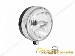 Perfect headlight for a nice sober and old school style! Medium diameter 10,5cm, chrome finish with grille with 2 bulbs.