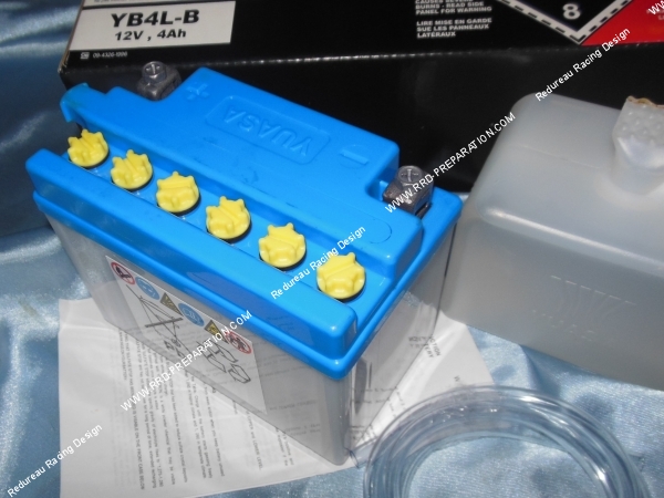 Here is YUASA YB4L-B battery. This very good quality battery is often used on the original machines. Standard it offers 12v for 4.2 amps. For getting started! Very simple, make the level with the acid delivered with the battery, then you will easily find it in supermarkets and even with us. Then charge it for 24 hours with the caps open! Leave it to stand for 1 hour, close the caps and mount it on the machine. Once mounted and the connectors installed, grease the terminals and protect the positive. Being with maintenance, every 12 months, make the liquid level with demineralized water or even acid and recharge the 12 hours.