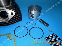 A small very strong high quality cast iron kit from MALOSSI with air cooling, 45.5mm diameter (actual 68cc), clean bore and finish good enough for a cast iron kit. It has 6 intake transfers and a very wide normal exhaust. Its diagrams are good and torquey, it is the exact copy of MALOSSI aluminum but in cast iron, so it has reduced performance and precision but a longer life and a much lower repair cost in the event of tightening. It is certainly the best 70cc cast iron kit on the market for Peugeot 103, fox and Honda wallaroo.