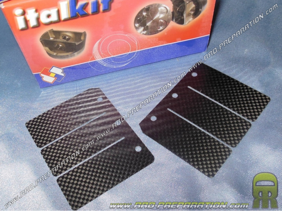For the refurbishment of your admission or literally increase your performance, here is the set of 2 plates of valves ITALKIT COMPETITION, they are made of carbon fiber, thickness is calculated, designed to increase power at high speed without losing torque low revs, while maintaining a frank admission, less damaging vibrations ... and therefore more performance. High quality certified, they are mounted on HONDA NSR, CR, CRM, CRE, RS, CAGIVA FRECCIA C12 ... MITO 125cc, 125 HUSQVARNA CR, WR 1994 to 1996, MONTESA COTA 314 and 314 R, SUZUKI RM 1982 1989 TM CROSS and ENDURO 1997 and 1999 125cc 2 Stroke, YAMA DT 250cc! Size 60X47mm, 3 fixing holes between axis 20mm.