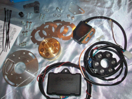 Eso sí, gracias a una eprom específica podrás disponer de varias curvas y un ajuste avanzado por combinación de números. De lo contrario, simplemente se detiene en 0,4 mm antes del TDC si lo tiene montado en un cigüeñal de carreras original y 0,35 mm para carreras largas (una ventaja para algunos que encontraron que la configuración en 0 no era necesariamente simple y precisa). Para aumentar el avance, basta con pivotar el estator hacia el sentido de giro (que unos 0,1 mm tiene el calibre) y al revés para disminuir. Muy sencillo gracias a los 2 tornillos pasamuros laterales. Su potencia se ha incrementado aún más a 42kv, la más alta del mercado (¡presta atención a los ajustes de carburación! Si eres pobre, tendrás un accidente mecánico rápidamente...). ¡Este encendido es más eficiente que MOTOPLATS, fue creado por el gran ALAIN GAUDOU (jefe de mvt y diseñador de piezas de competencia de renombre)!