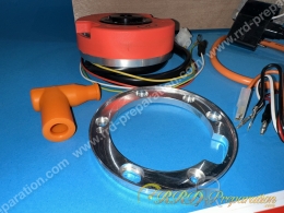 Desarrolla hasta 22.000 rpm como máximo con 2 chispas por revolución. ¡Obviamente siempre conserva su circuito de iluminación para alimentar sus luces, bomba de agua o accesorios! Este encendido es el único rotor interno con encendido confiable y potente en el mercado con el estándar premium. ¡En términos de apariencia, apreciará o no el color naranja fluorescente del estator! Una ventaja negativa para el rotor que está anodizado en negro... ¡Aparte de eso! El rotor, la bobina HT… Sigue siendo técnicamente idéntico al premium. Lamentamos la ausencia de un disco de inercia (a algunas personas les gusta usar este tipo de accesorios, especialmente en la pista).