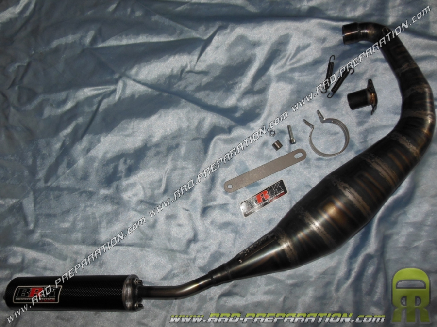 En fina jaula soldada laminada, su resonancia es siempre excelente. En cuanto al acabado, es suave y limpio. Las soldaduras son de calidad y estampadas para evitar que queden en relieve. Acabado sin barnizar con placa de aluminio cortada con láser y grabada BRK, no lleva brida en la entrada, ni en el interior ni en la salida. Es un escape exclusivamente destinado a la competición en circuito, run... en paso bajo y muy ligero!
