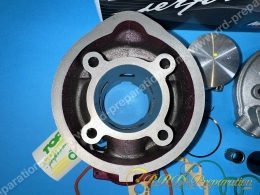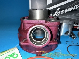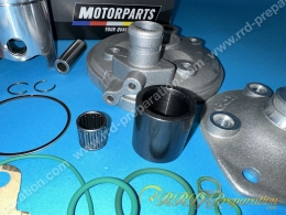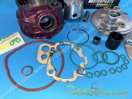 Un muy buen kit cuya reputación es insuperable, este hermoso kit es el conocido y renombrado TOP ROSE con espárrago, ciertamente es de hierro fundido pero tratado con MINACROM y en un segmento mono abombado de cromo duro para permitir las velocidades más altas, diámetro 49,5 milímetros, pistón reforzado en monosegmento fino, diagramas muy avanzados basados en medio par/medio alto régimen, tiene como es habitual en las piezas de motor nuevas engrasadores debajo de los laterales, el kit está muy limpio y acabado. Es la evolución de la Top performance rosa normal gracias a su espárrago (tornillo en 2 partes) y su jaula de agujas reforzada incluida en el kit. Esta culata tiene una cámara de alta compresión cónica pulida y, por lo tanto, permite un rendimiento relativamente bueno.
