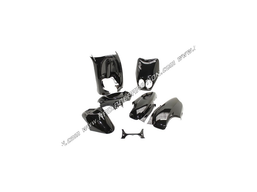 Tipo original, aquí está el paquete de 7 carenados, carcasas P2R para scooter de 2 tiempos de 50 cc MBK OVETTO y YAMAHA NEO'S ... . Este set incluye la cara delantera, los cascos, el guardabarros delantero, la parte superior de la cara delantera, los protectores de carenado,... todo en color negro. ¡Son de buena calidad y le permitirán comenzar de nuevo y a un costo menor en comparación con el carenado original comprado en el concesionario!
