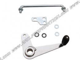 Aquí está el pedal de arranque REPLAY para Peugeot 103 y MBK 51, ¡cuidado, este modelo no se ajusta a los PEUGEOT 103 SPX, RC X, MVX y CLIP! Este modelo de pedal es bastante básico pero articulado. Pondrás el pedal de acero cromado en el eje de la polea (donde pones las punteras o pedal de arranque). ¡Después, simplemente coloque la placa de metal en el motor para unir las 2 partes usando la barra! Cuando el motor suba, el pedal también subirá, simplemente presiónelo para bajar el motor (por lo tanto, vuelva a abrir la transmisión) para aumentar la velocidad y, por lo tanto, dar un impulso.