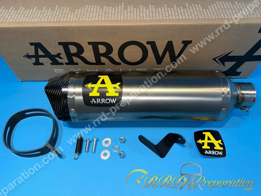 Reforzado a todos los niveles, sólido y ultra resistente, este silenciador se entrega con su documentación, abrazadera, adhesivos, tornillos,... Este producto va montado sobre el racor ARROW 71617MI que va instalado sobre el colector original. Foto contractual por venir.