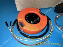 Pour augmenter l’avance, il suffit de pivoter le stator vers le sens de rotation (que quelque 0,1mm a la pige) et l’inverse pour diminuer. Très simple grâce aux 2 vis alen latérales. Sa puissance a encore été augmentée a 42kv, soit la plus élevée de tout le marché (attention au réglages carburation! Si on est pauvre on vas vite a l’accident mécanique…). Cet allumage est plus performant que les MOTOPLATS, il a été créé par le grand ALAIN GODOU (patron MVT et concepteur de pièces compétition de grande renommée)! Il développe jusqu’à 22 000 tours / minutes maximum avec 2 étincelles par tours. Évidement il préserve toujours son circuit d’éclairage afin d’alimenter vos lumières, pompe à eau ou accessoires! Cet allumages est le seul rotor interne avec éclairage fiable et puissant du marché avec le premium standard. Niveau look, vous apprécierez ou non la couleur orange fluo pour le stator!