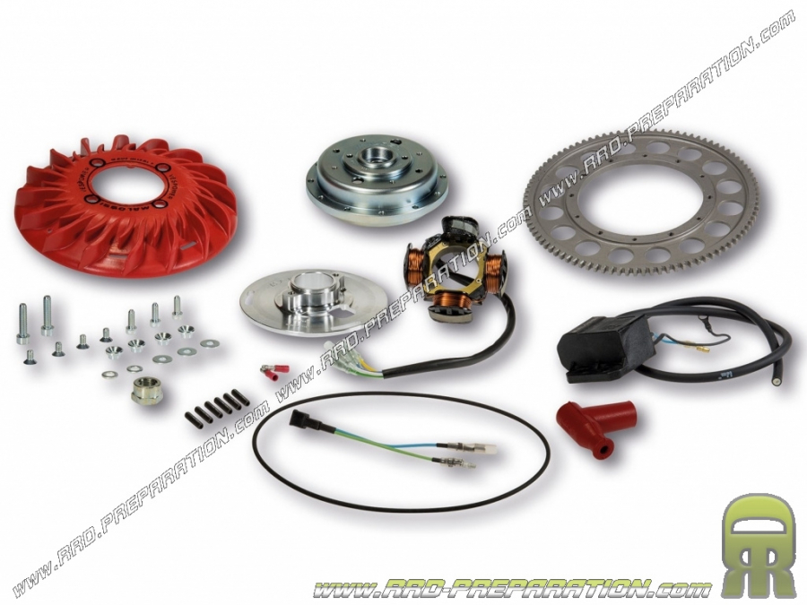 Tout d'abord, son volant est plus léger en comparaison à l'origine, avec des matériaux plus solide et résistant il pèse 1,2 Kg. Vous pourrez si vous le souhaitez, ajouter des masses (vendues en séparées, non fournit avec l'allumage) pour modifier l'inertie de celui-ci en fonction de la préparation de votre scooter. Son stator est équipé de 4 pôles en 12V (90 Watt) avec un branchement électrique pour charger votre batterie.