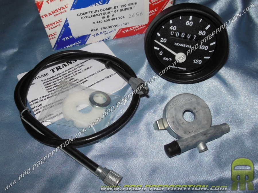 Pour le plus grand bonheur de tous les passionnées, le voici chez nous. Le compteur de vitesse d'origine TRANSVAL pour les cyclomoteurs MBK 51, 51 S et autres modèles avec jantes GRIMECA. De forme rond comme présenté, la montée en vitesse est indiqué via une aiguille blanche visible (jusqu'à 120 km/h) sur une écriture blanche. Il dispose aussi d'un compteur kilométrique pouvant totaliser jusqu'à 9 999 km. Système d'éclairage intégré a raccorder sur 12V standard, ampoule non fournie.