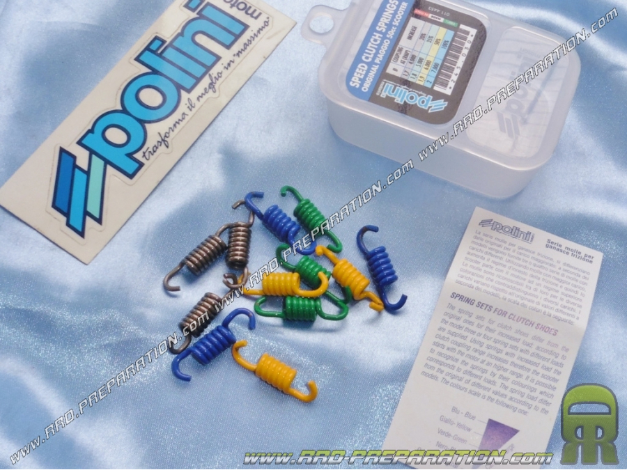 Voici la boite de ressorts POLNI pour scooter PIAGGIO, VESPA, GILERA, APRILIA et bien d'autres. Assortiments présenté avec 4 lot de 3 ressorts de différentes gamme. Du noir au bleu en passant par le vert et le jaune, ils sauront être d'une éfficacité redoutable une fois montés et réglés !