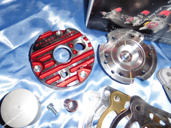 Voici le kit complet MALOSSI MHR TESTA ROSSA 70cc en Ø47,6mm, en 7 transferts, mono segment et échappement a barette...