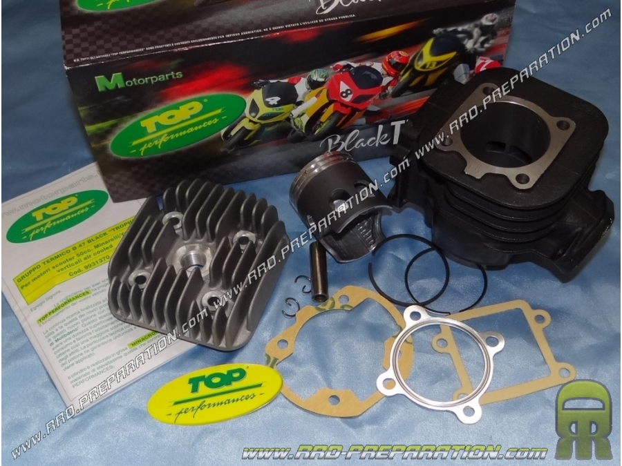 Voici le kit 70cc TOP PERFORMANCES BLACK "TROPHY" , celui ci est réalisé avec un traitement "MINACROM" de bonne qualité. Il dispose de 5 transferts. Son admission ainsi que ses diagrammes sont retravaillés lui permetttant un couple moteur excellent. Les transferts et l’échappement sont fignolés à la main en usine Top performances.