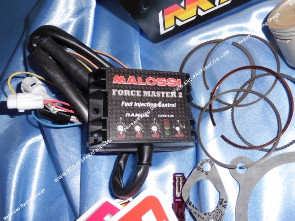 Vous l’attendiez tous… Le gros kit qui va enfin faire rugir vos maxi scooters 125cc YAMAHA N-MAX ou MBK OCITO 155 / 150! Le voici, le fameux kit Ø63mm qui est en plus livré avec le calculateur électronique multi courbe Comme à son habitude MALOSSI a fait un kit puissant, solide, coupleux et de très haut de gamme. Ce petit monstre vas projeté votre cylindrée de 125cc a 182,58cc réel de performances extrêmes. MALOSSI a pour ce groupe thermique trouvé le ratio parfait course / diamètre, ce cylindre sera sans problème supporté par votre vilebrequin d’origine. Il court déjà en compétition et en endurance c’est donc dire si il est testé… Force Master 2 est le boîtier électronique qui permet de changer l’injection pour s’adapter parfaitement au nouveau groupe thermique 4t Malossi. Ce boîtier a été programmé avec différents programmes afin d’être accouplé parfaitement à votre véhicule n’importe quelle soit sa configuration! Avec ce boîtiers 4 courbes vous sont offertes…