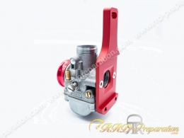 La plaque du carburateur est fabriquée en aluminium 6062 T6 et anodisée en rouge. Outre la possibilité d'installation dans des espaces restreints, comme dans le Ciao, le collecteur d'admission permet de raccourcir considérablement la course d'admission et donc d'obtenir une bien meilleure réponse.