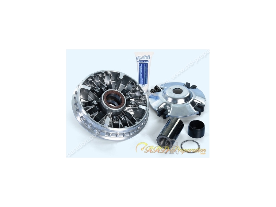 Grâce à lui, fini les accélérations molles et lentes ! S'adaptant sur différents modèles (voir liste ci-dessous), il est livré avec 1 jeu de galets bien étudié permettant un réglage optimal ainsi qu'un tube de graisse pour éviter le grippage de la joue mobile. Il est livré avec un jeu de ressort d'embrayage pour améliorer l'accélération et la reprise !